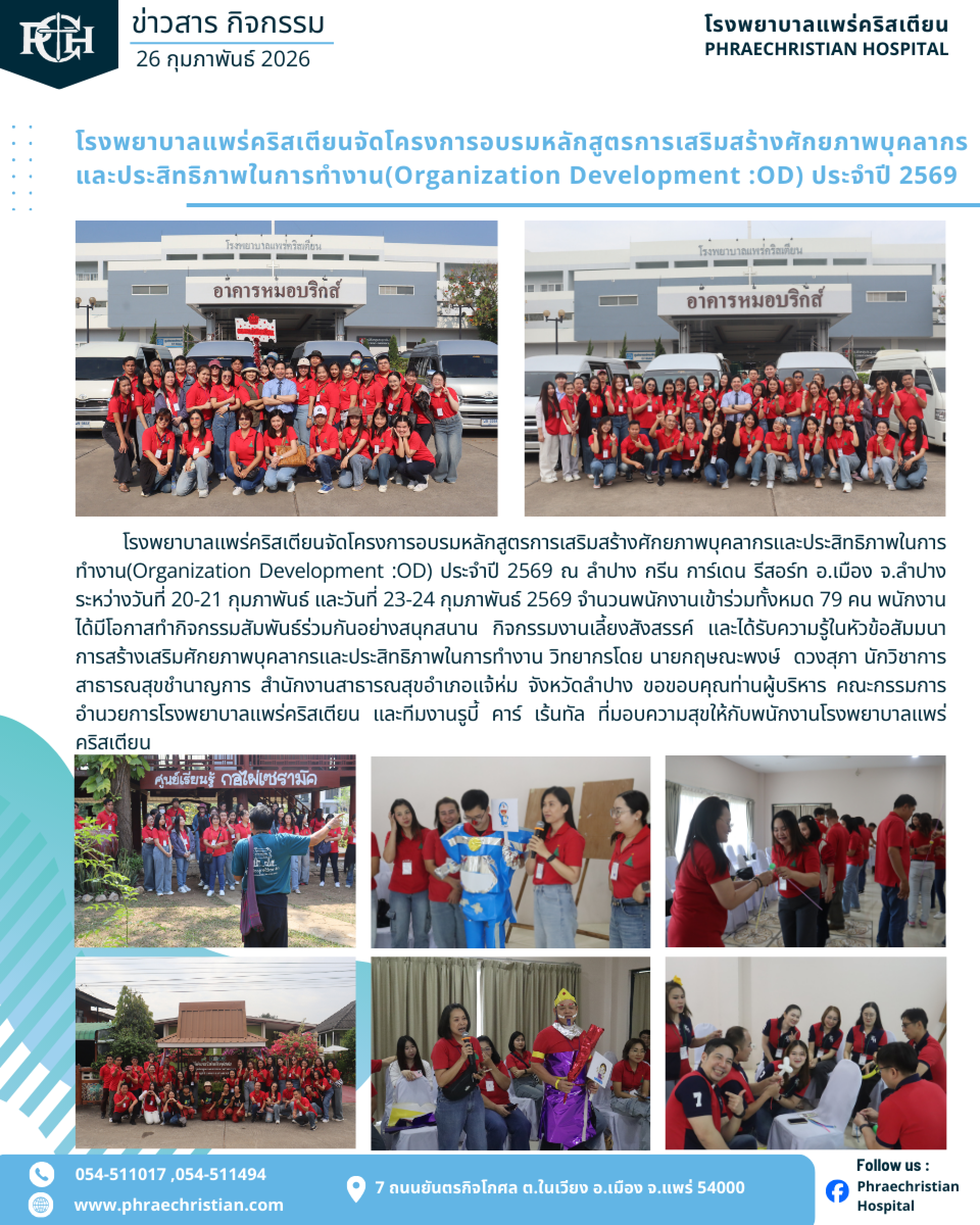 โรงพยาบาลแพร่คริสเตียนจัดโครงการอบรมหลักสูตรการเสริมสร้างศักยภาพบุคลากรและประสิทธิภาพในการทำงาน(Organization Development :OD) ประจำปี 2569 ณ ลำปาง กรีน การ์เดน รีสอร์ท อ.เมือง จ.ลำปาง ระหว่างวันที่ 20-21 กุมภาพันธ์ และวันที่ 23-24 กุมภาพันธ์ 2569 จำนวนพนักงานเข้าร่วมทั้งหมด 79 คน พนักงานได้มีโอกาสทำกิจกรรมสัมพันธ์ร่วมกันอย่างสนุกสนาน กิจกรรมงานเลี้ยงสังสรรค์ และได้รับความรู้ในหัวข้อสัมมนา การสร้างเสริมศักยภาพบุคลากรและประสิทธิภาพในการทำงาน วิทยากรโดย นายกฤษณะพงษ์ ดวงสุภา นักวิชาการสาธารณสุขชำนาญการ สำนักงานสาธารณสุขอำเภอแจ้ห่ม จังหวัดลำปาง ขอขอบคุณท่านผู้บริหาร คณะกรรมการอำนวยการโรงพยาบาลแพร่คริสเตียน และทีมงานรูบี้ คาร์ เร้นทัล ที่มอบความสุขให้กับพนักงานโรงพยาบาลแพร่คริสเตียน