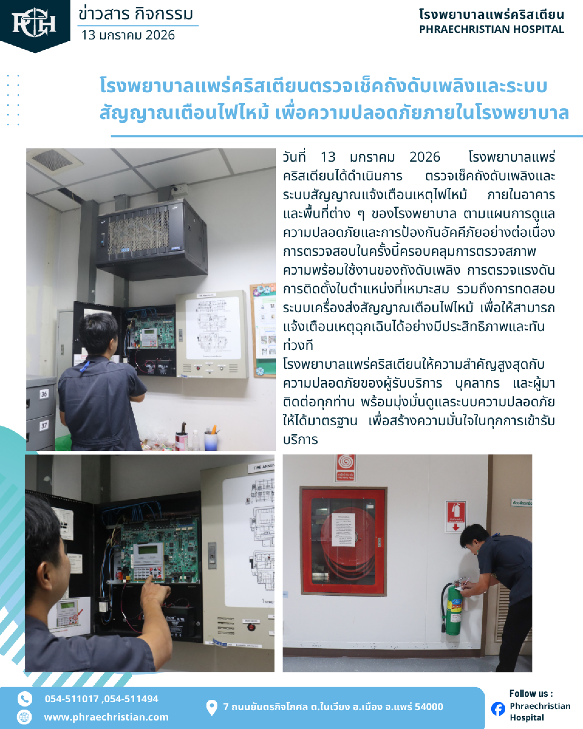วันที่ 13 มกราคม 2026 โรงพยาบาลแพร่คริสเตียนได้ดำเนินการ ตรวจเช็คถังดับเพลิงและระบบสัญญาณแจ้งเตือนเหตุไฟไหม้ ภายในอาคารและพื้นที่ต่าง ๆ ของโรงพยาบาล ตามแผนการดูแลความปลอดภัยและการป้องกันอัคคีภัยอย่างต่อเนื่อง