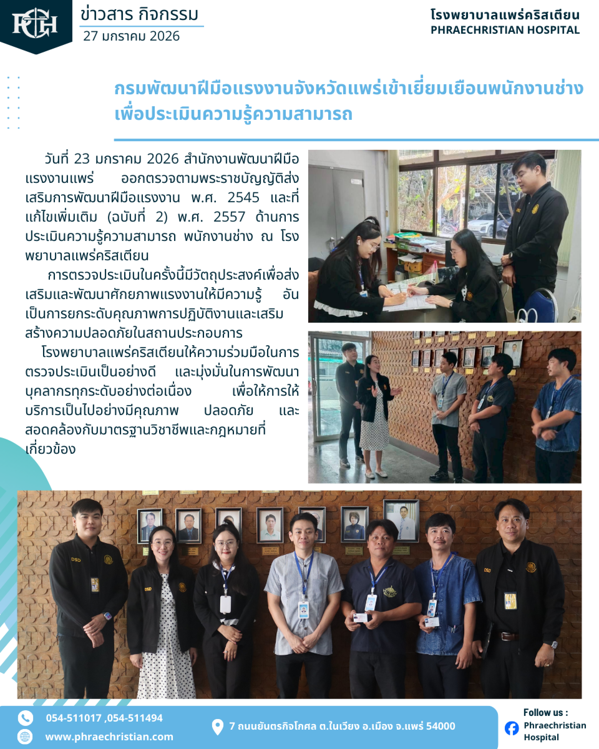 วันที่ 23 มกราคม 2026 สำนักงานพัฒนาฝีมือแรงงานแพร่ ออกตรวจตามพระราชบัญญัติส่งเสริมการพัฒนาฝีมือแรงงาน พ.ศ. 2545 และที่แก้ไขเพิ่มเติม (ฉบับที่ 2) พ.ศ. 2557 ด้านการประเมินความรู้ความสามารถ พนักงานช่าง ณ โรงพยาบาลแพร่คริสเตียน